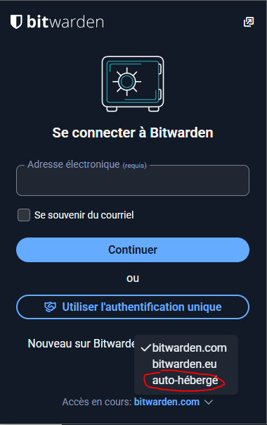 Cliquez sur l’icône de l’extension. Lors de la première connexion, cliquez en bas sur “bitwarden.com” puis sélectionnez “Auto-hébergé”.